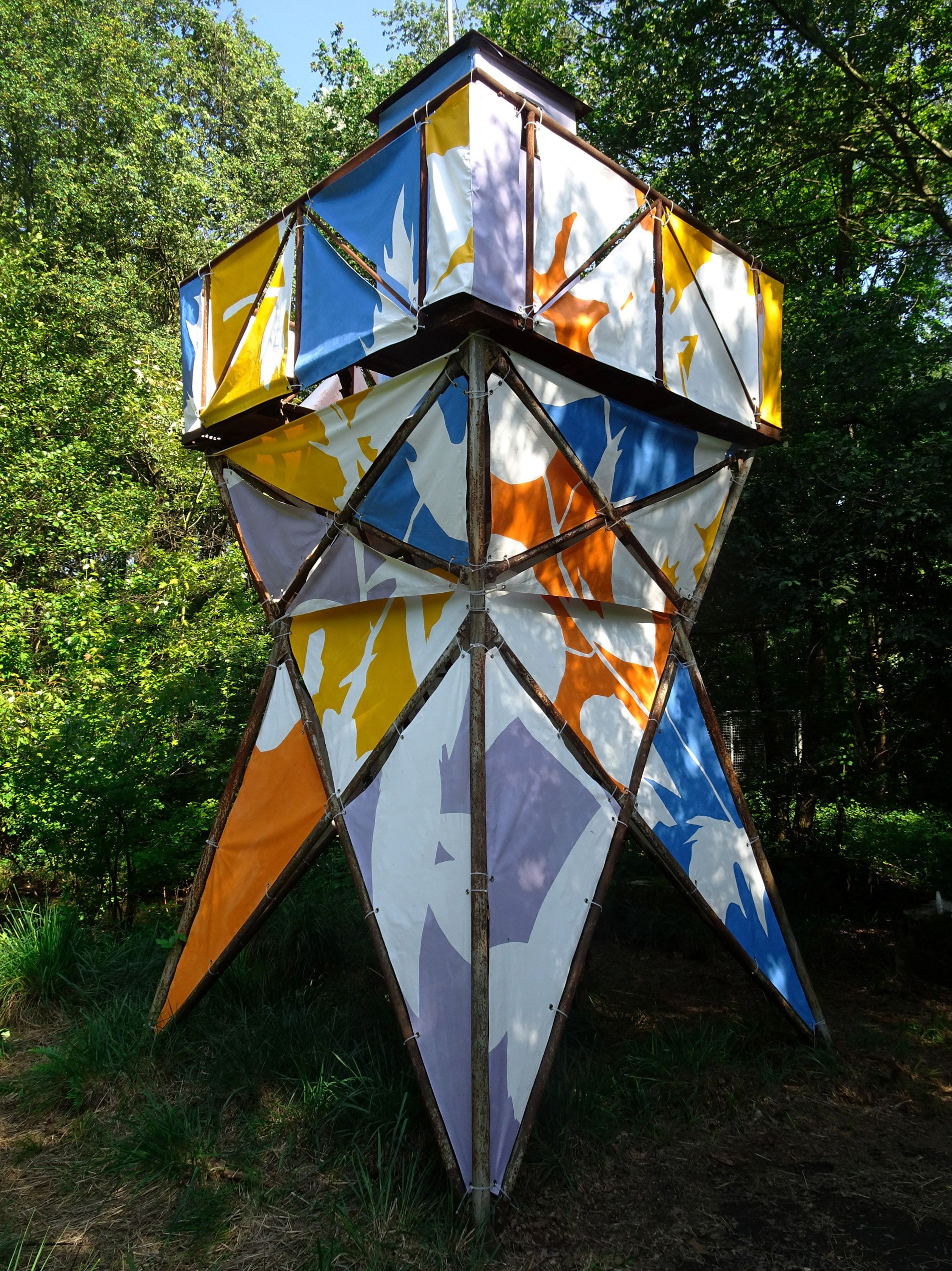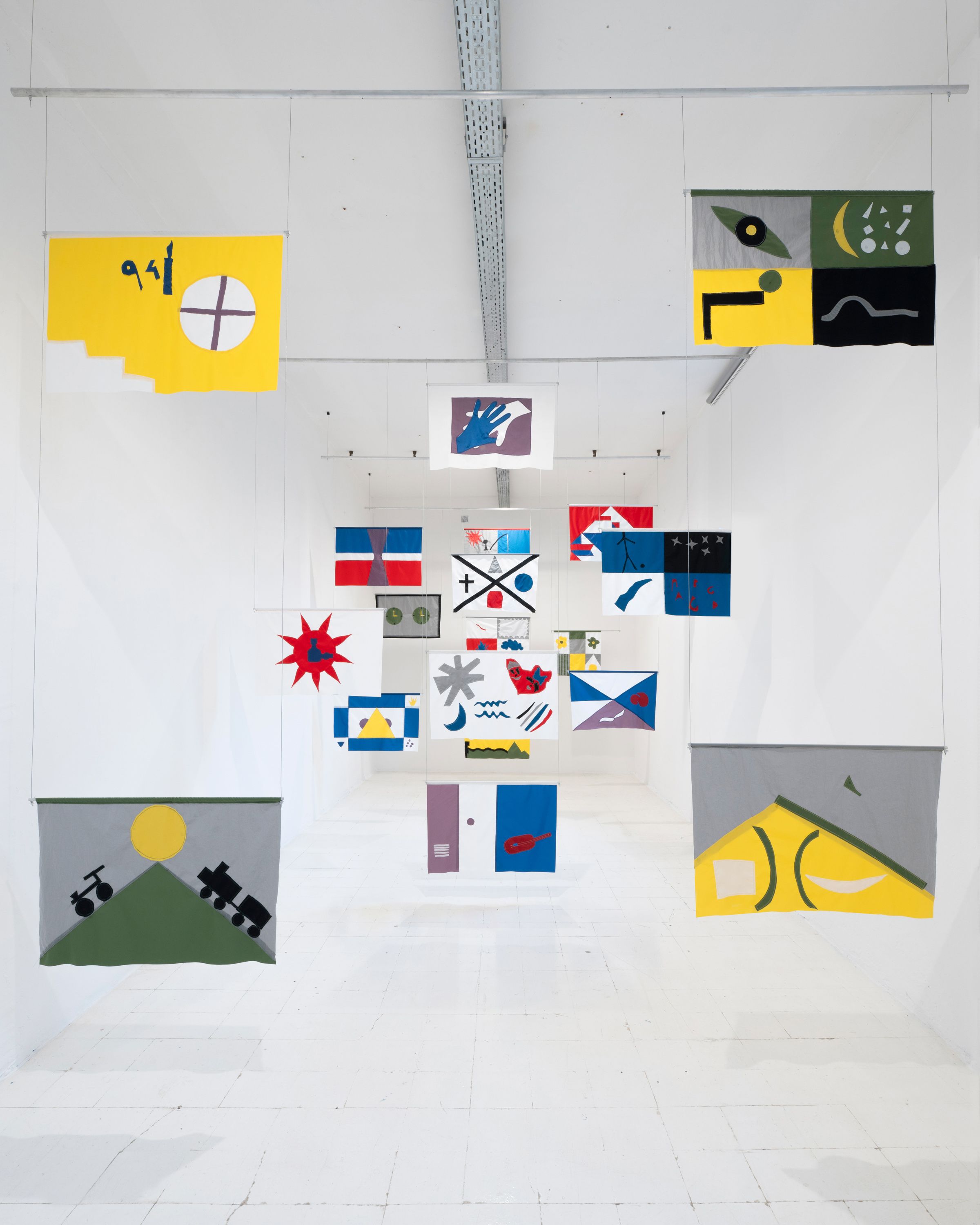 4-20 Airmarks (2021) is a wind-activated kinetic sculpture. Painted with figurative symbols, the work transforms images into ever-changing chromatic abstractions, engaging with the environment under unpredictable weather conditions. In doing so, it rejects the idea of the artwork as a fixed object or end in itself, instead emphasizing lived experience and the creation of ephemeral situations and actions.