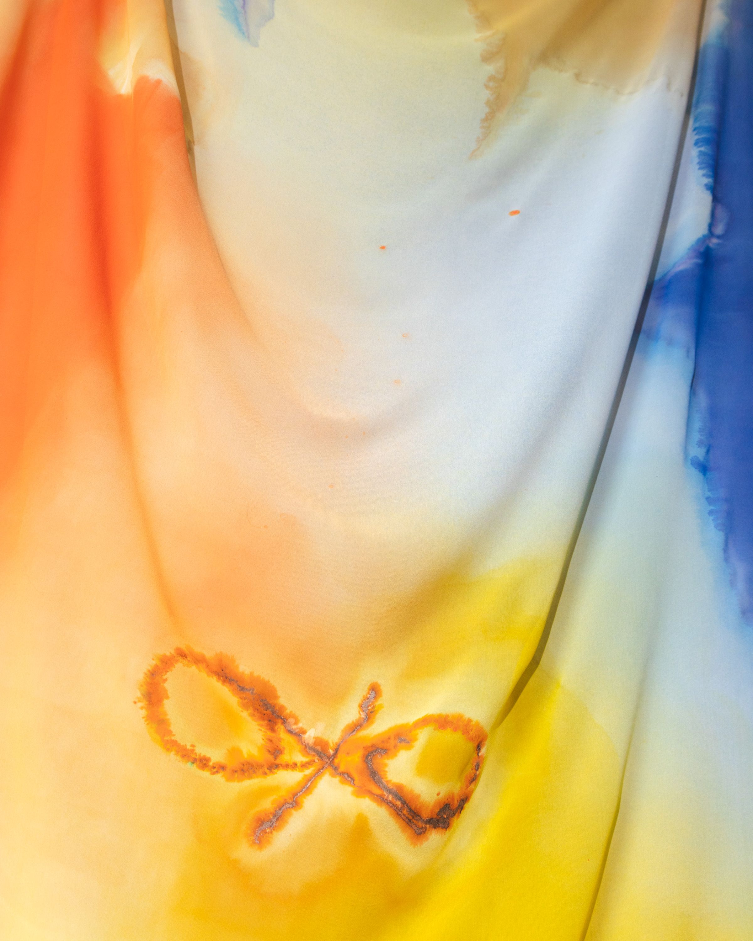 Auratica (2022) is an installation born from the harmonious composition of a series of suspended sculptural works, both pictorial and sonic in nature. Each piece consists of a hand-painted silk chiffon sail and a tubular bell, each with a unique shape and sound.