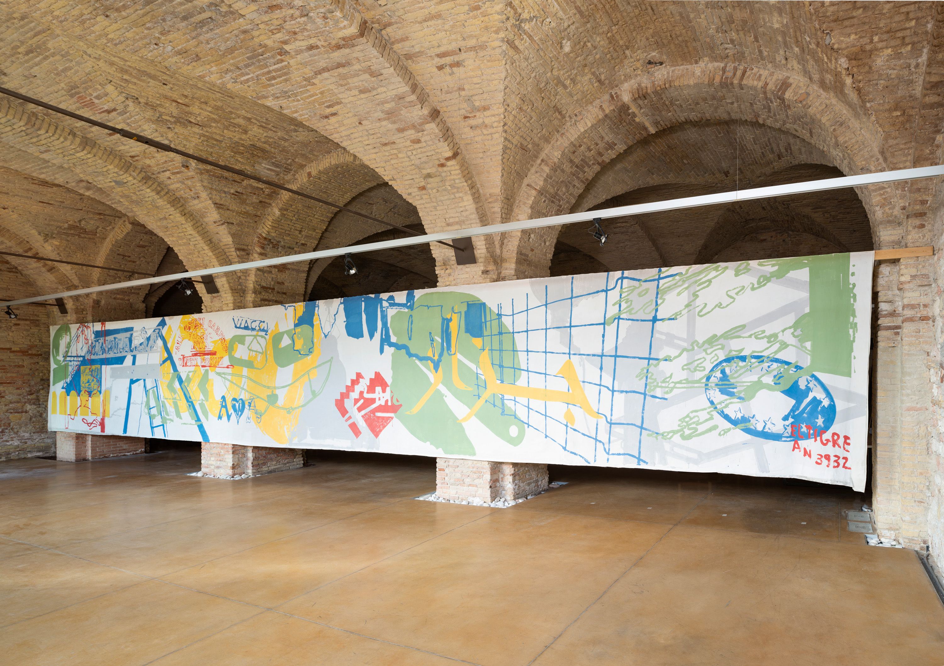 OPEN SIGNS (2020) is a site-specific project by Oliviero Fiorenzi created during an artist residency at the Mole Vanvitelliana. Through a daily routine of exploring the neighborhood, the artist collected symbols, signs, and urban memories, translating them into a mural painting displayed in the courtyard of the Mole. The project, which explores the dialogue between inside and outside, was presented on September 24, 2020, accompanied by a discussion curated by Elvira Vannini and Alessio Piancone.