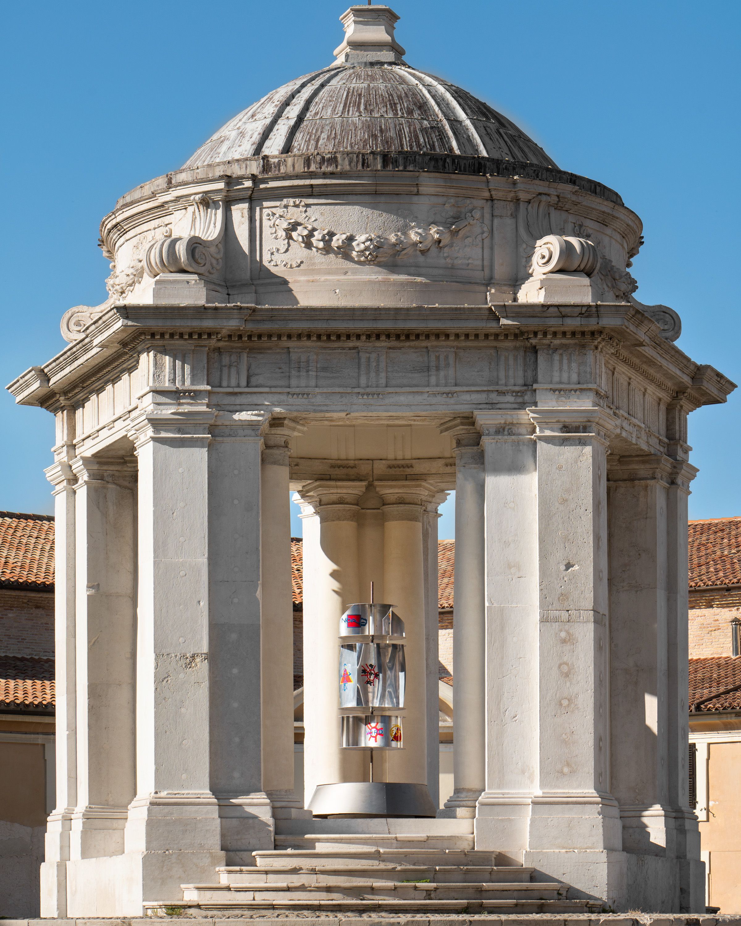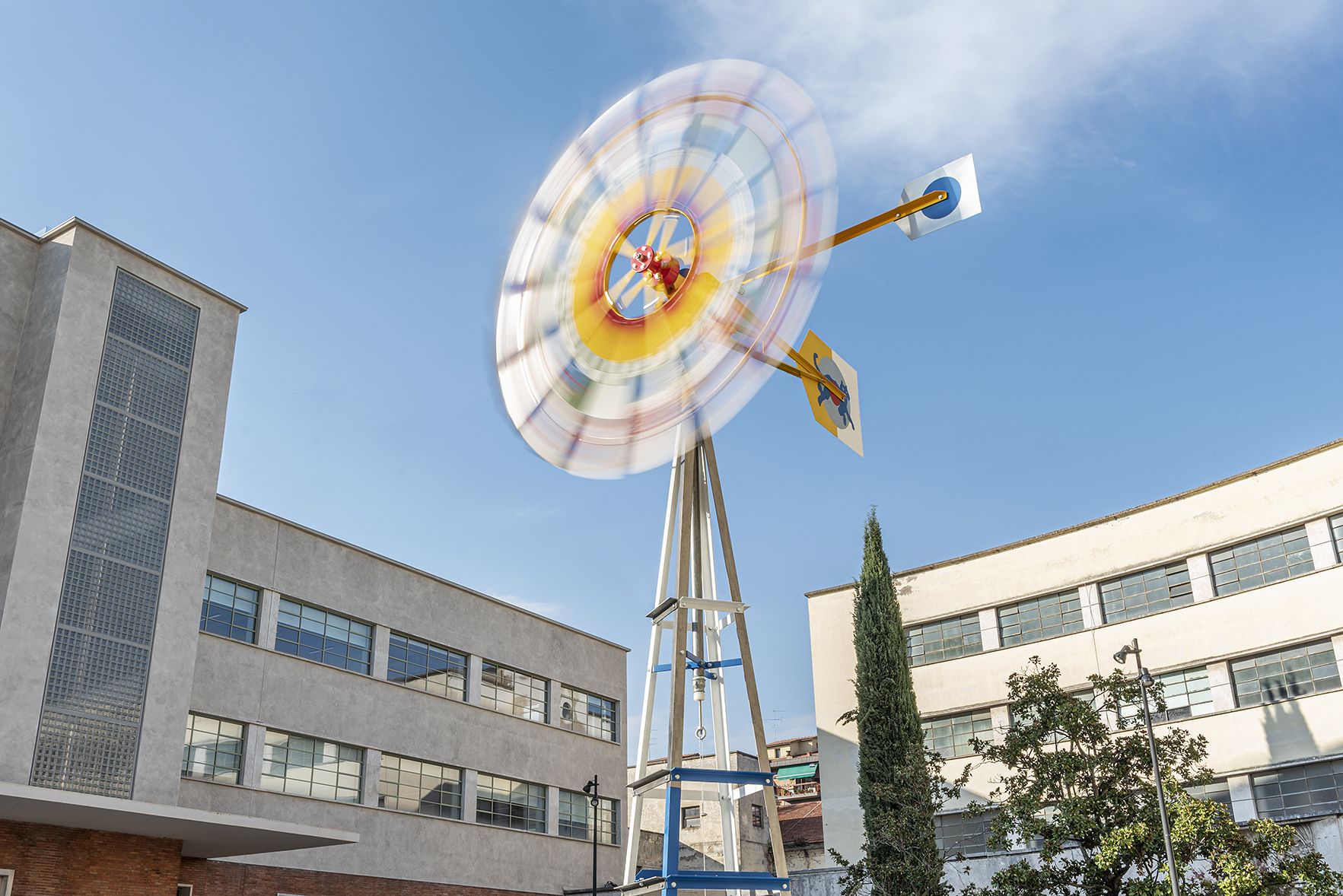 MEMORY SPIN by Oliviero Fiorenzi is a site-specific installation that uses play to challenge the conventions of contemporary art. Through the rotation of a propeller and optical illusions, the work evokes “vertigo,” encouraging the audience toward active and critical interaction against cultural homogeneity.