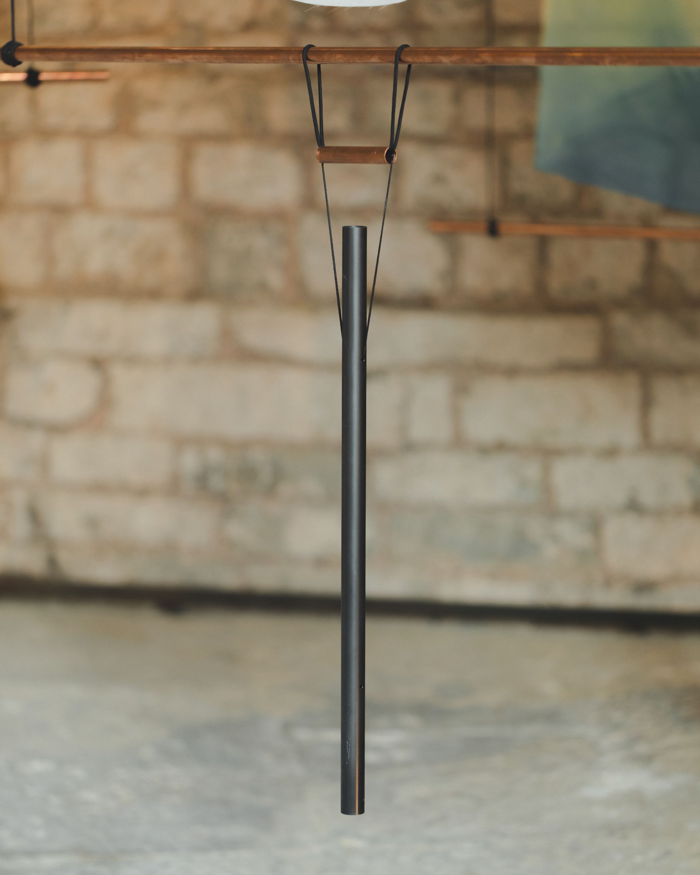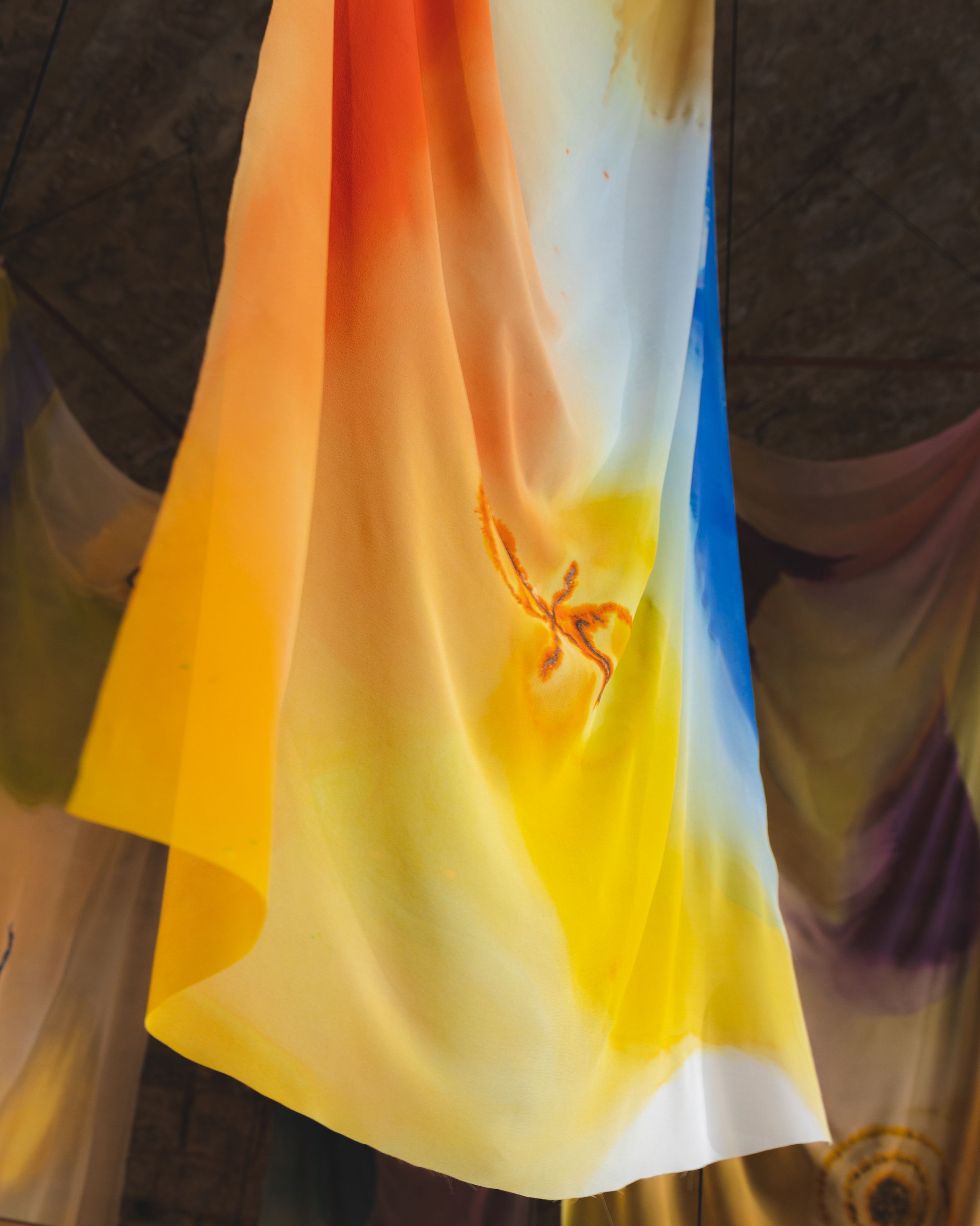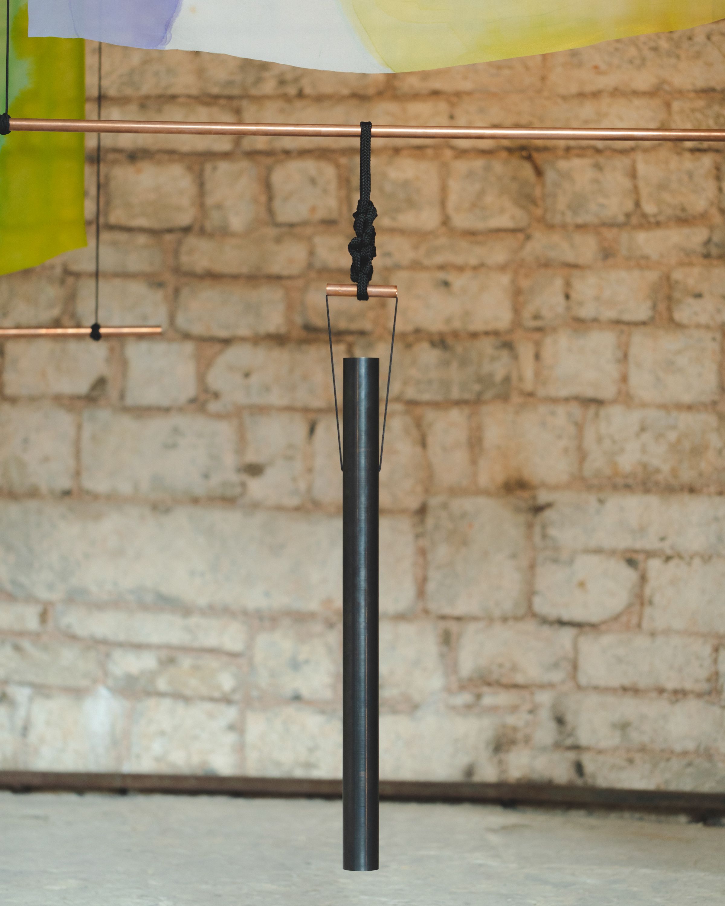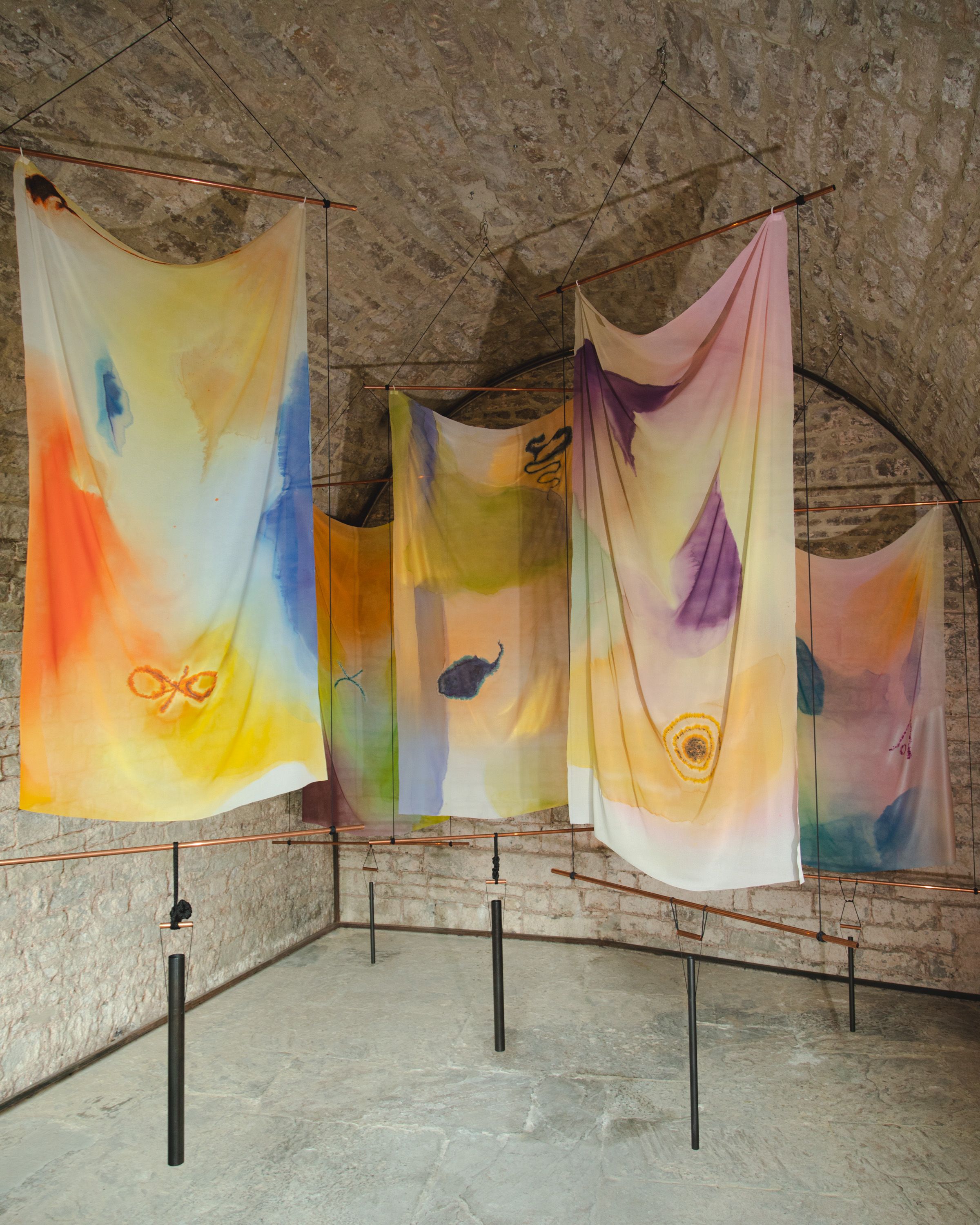 Auratica (2022) is an installation that emerges from the harmonious composition of a series of suspended sculptural works combining painting and sound, installed within the former fountain space of Spazio Volta. Each piece consists of a silk chiffon sail painted by four hands, paired with a tubular bell of varying form and tone.