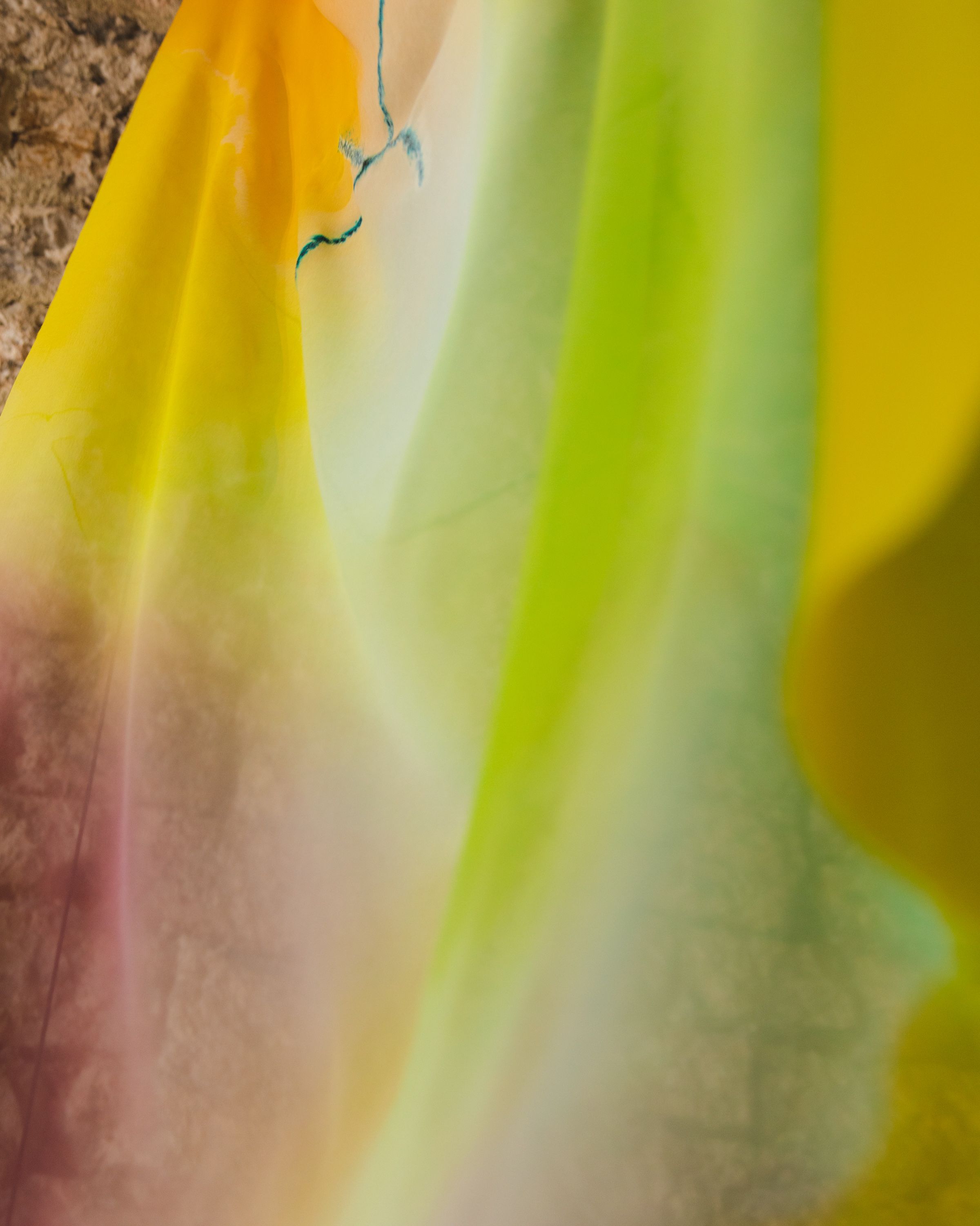 The chiffon carries a painterly texture, yet its semi-transparency allows the surrounding space to remain visible, and its lightness enhances its responsiveness to movement - whether triggered by a passerby or a breeze - creating a single body of floating sculptures in motion. The gentle draft entering through the grate may animate the installation, depending on the conditions, like a breath.