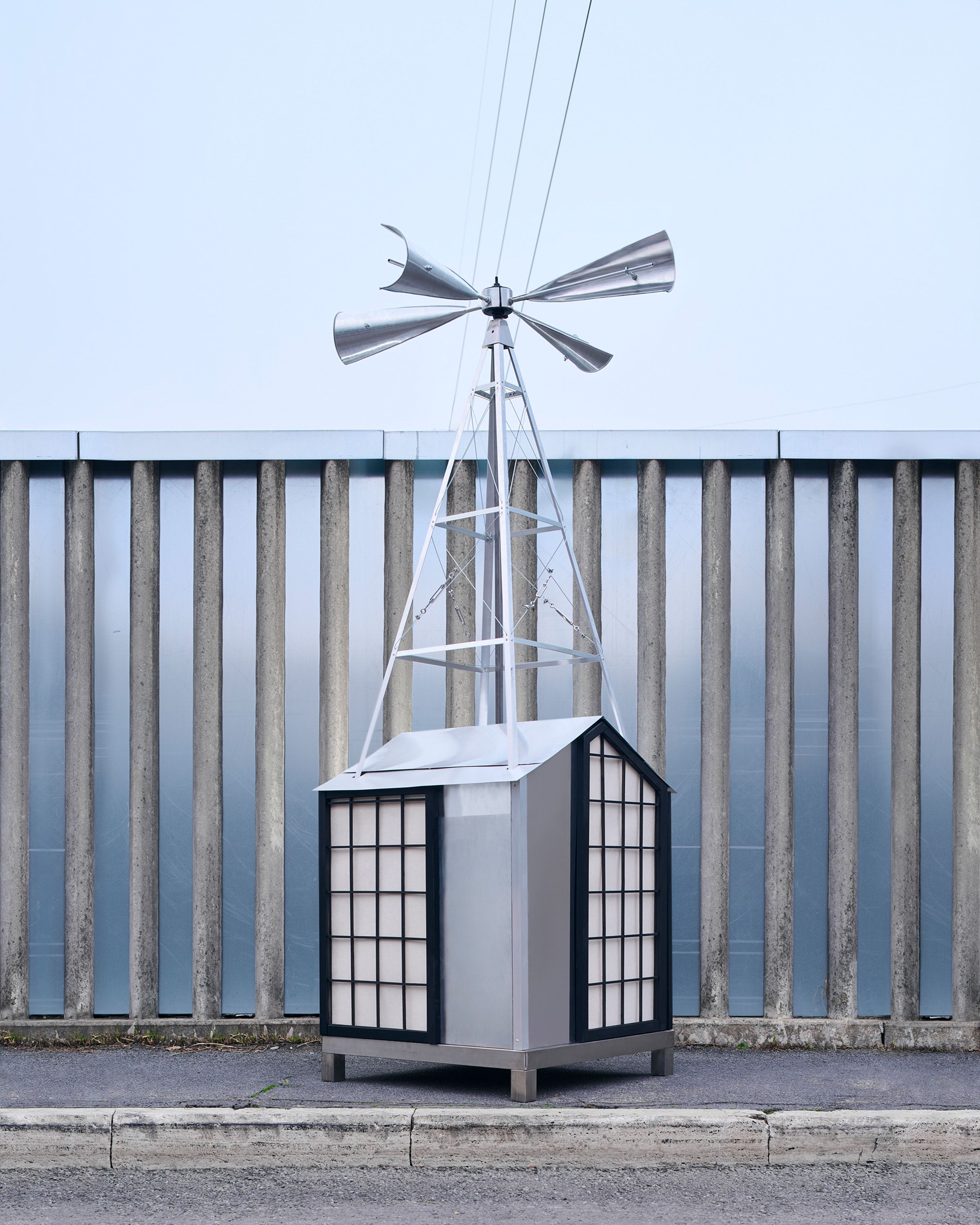 At the core of the sculpture, a light powered by the motion of the windmill blades symbolizes the domestic hearth—a human presence that responds to the natural energy of the wind. This light, visible through semi-transparent materials, emits a flickering, unpredictable glow, like an introverted beacon illuminating the interior rather than projecting outward.