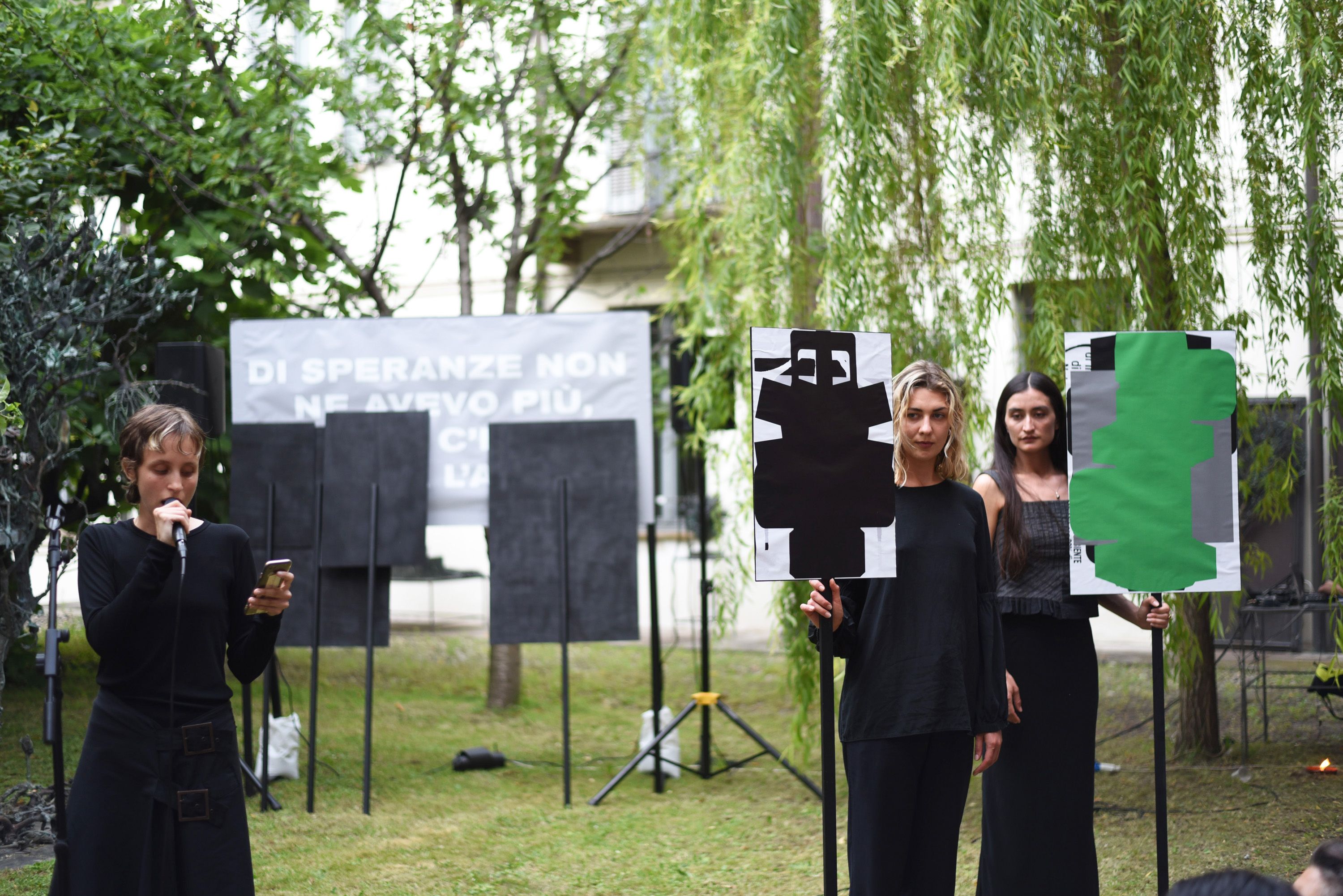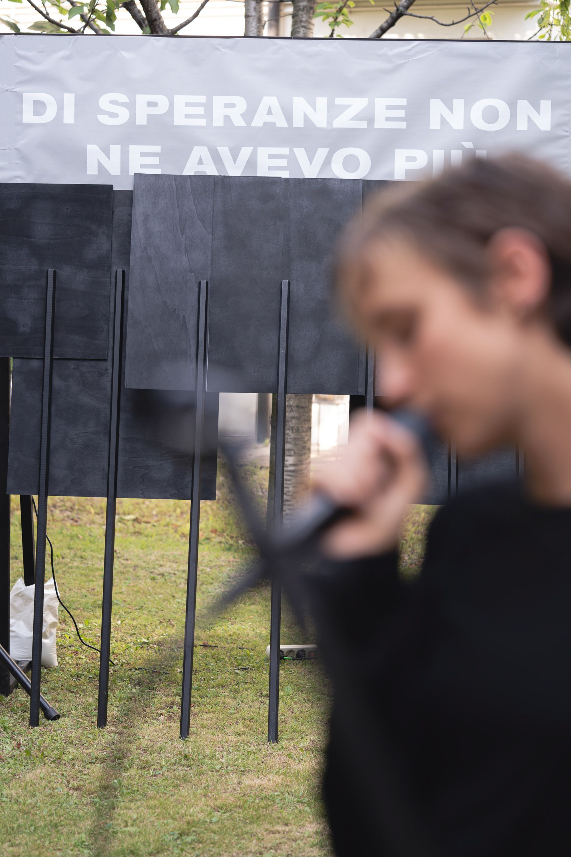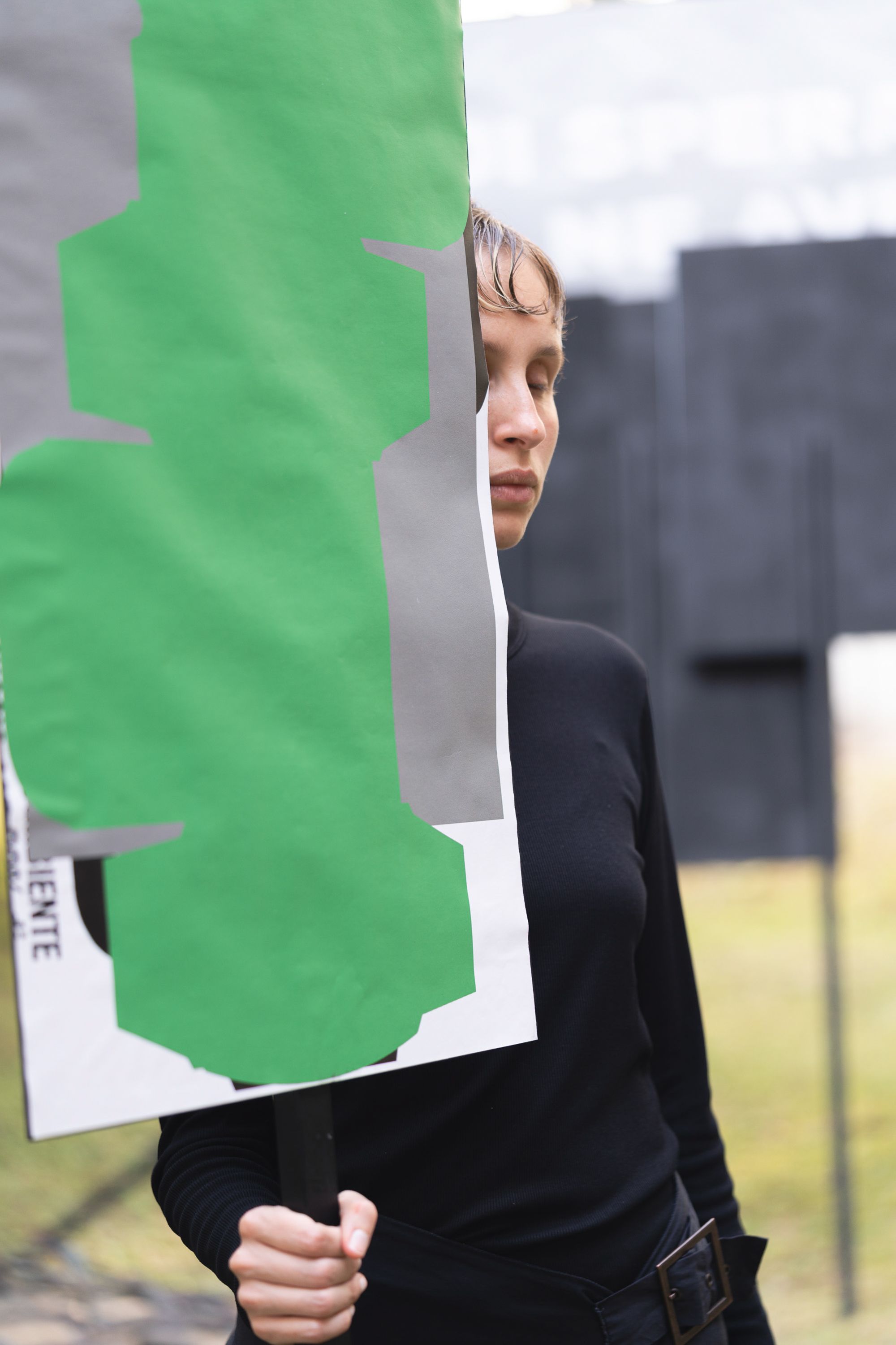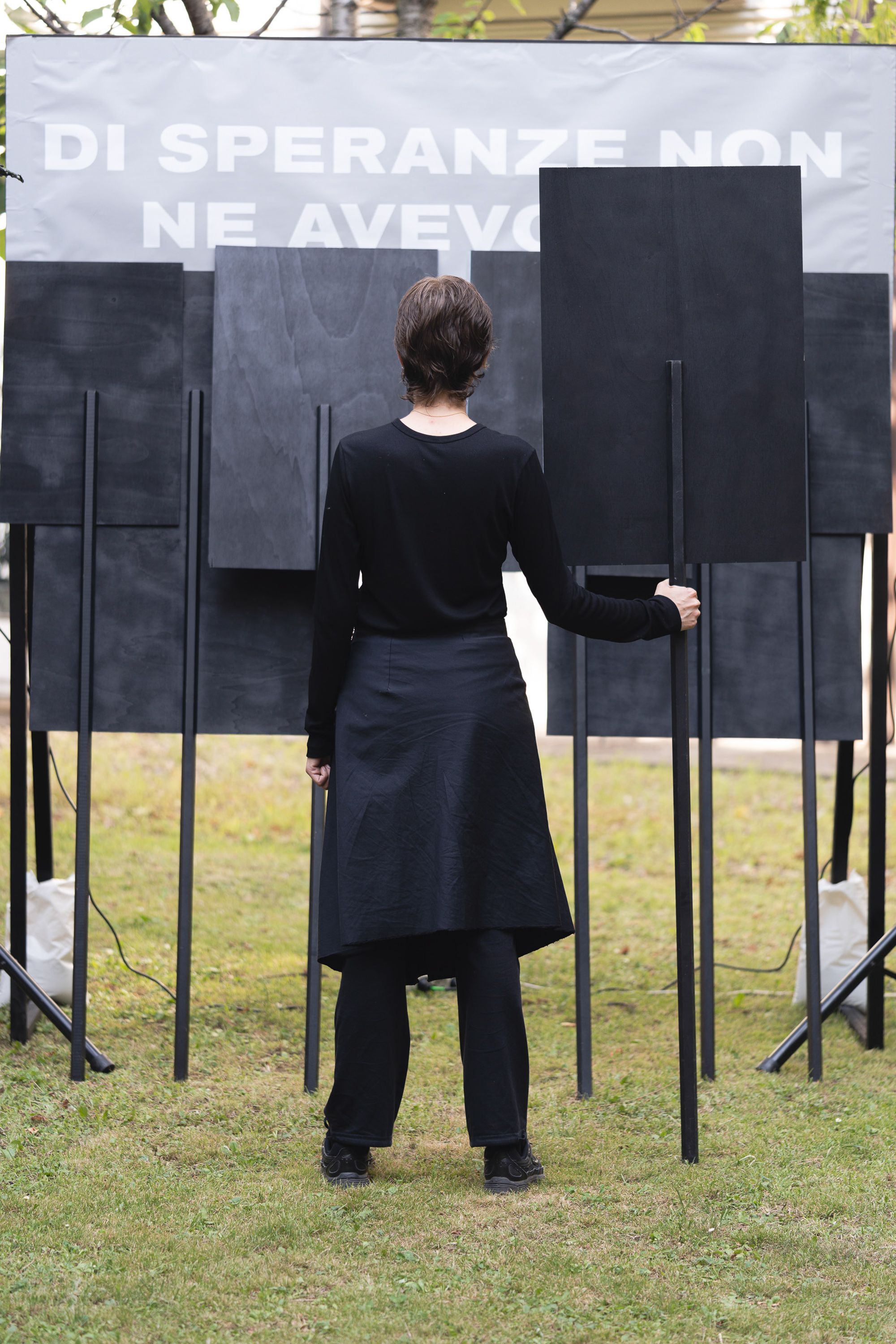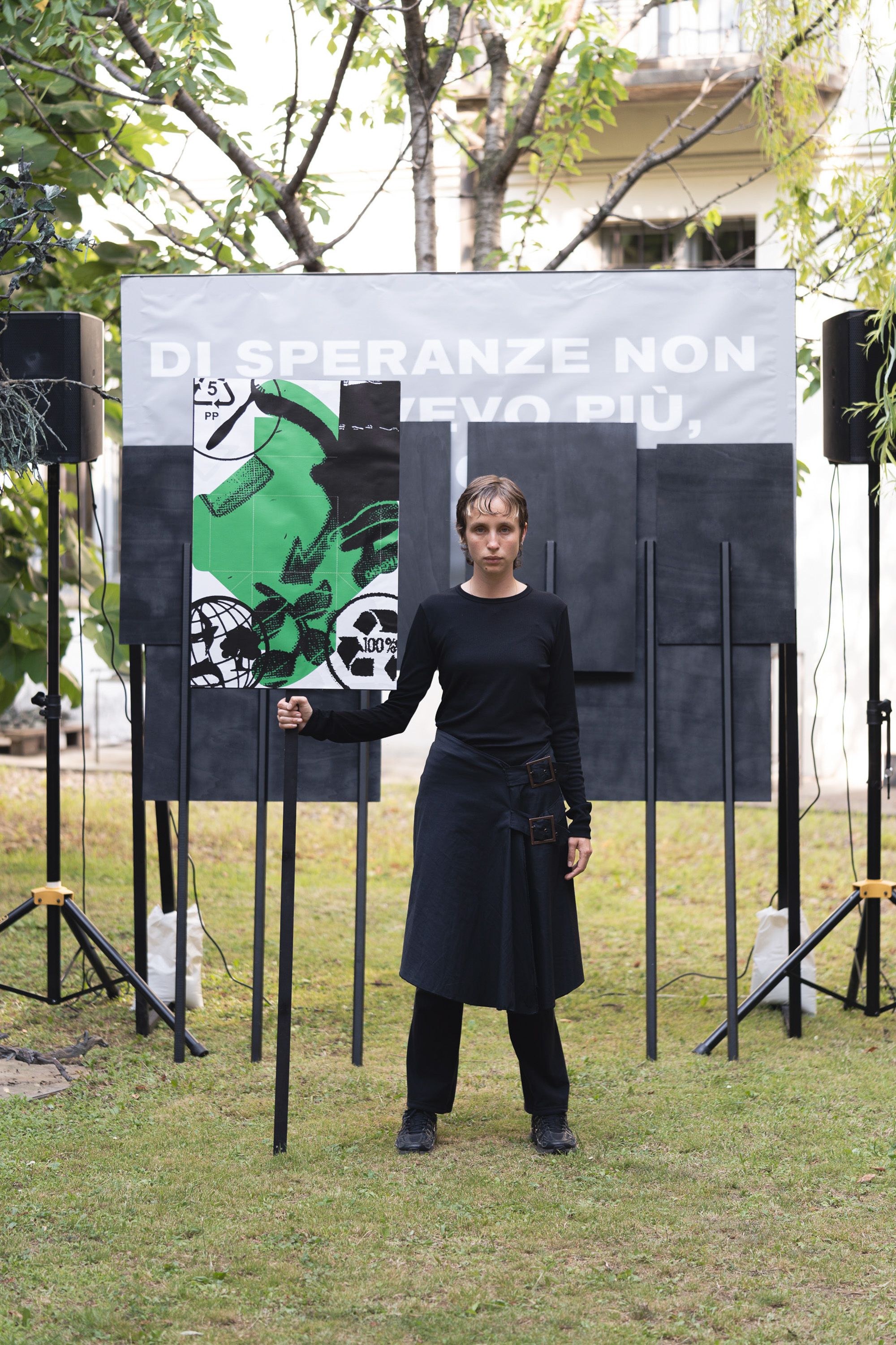 The performance unfolds in an enclosed garden, where Francesca Flora’s voice recites texts alluding to the language used by companies to mislead through greenwashing. Alongside her, seven green and black panels, inspired by environmental certification logos, reveal deceptive marketing techniques such as hiding the truth, using false labels, or emphasizing irrelevant aspects. The work’s ambiguity lies in the awareness that we are all subject to a system that deceives, sometimes unintentionally. As in Lem’s novel, we confront a world that is not as it seems, and the real struggle is the difficulty of resisting these deceptive realities.