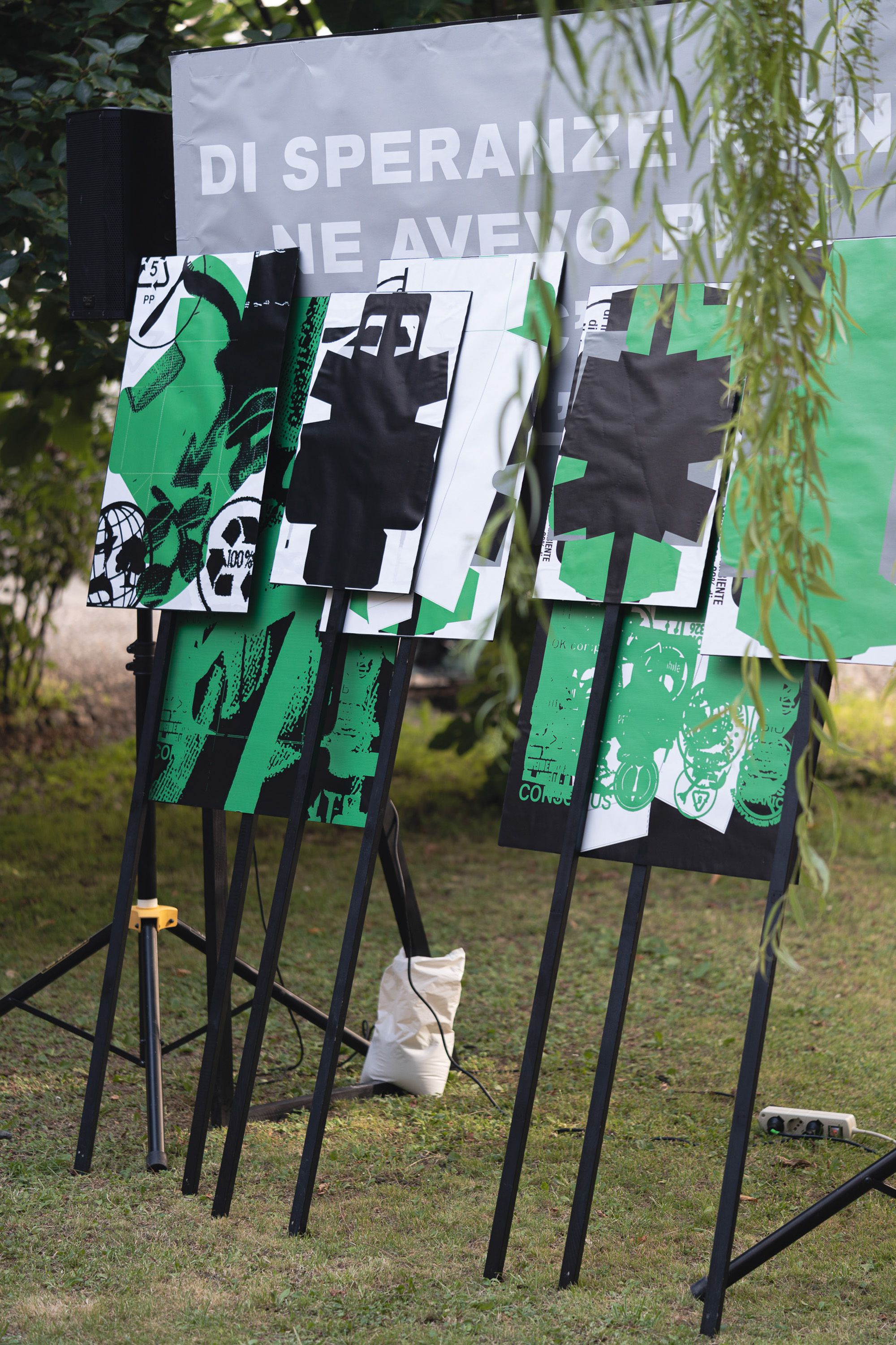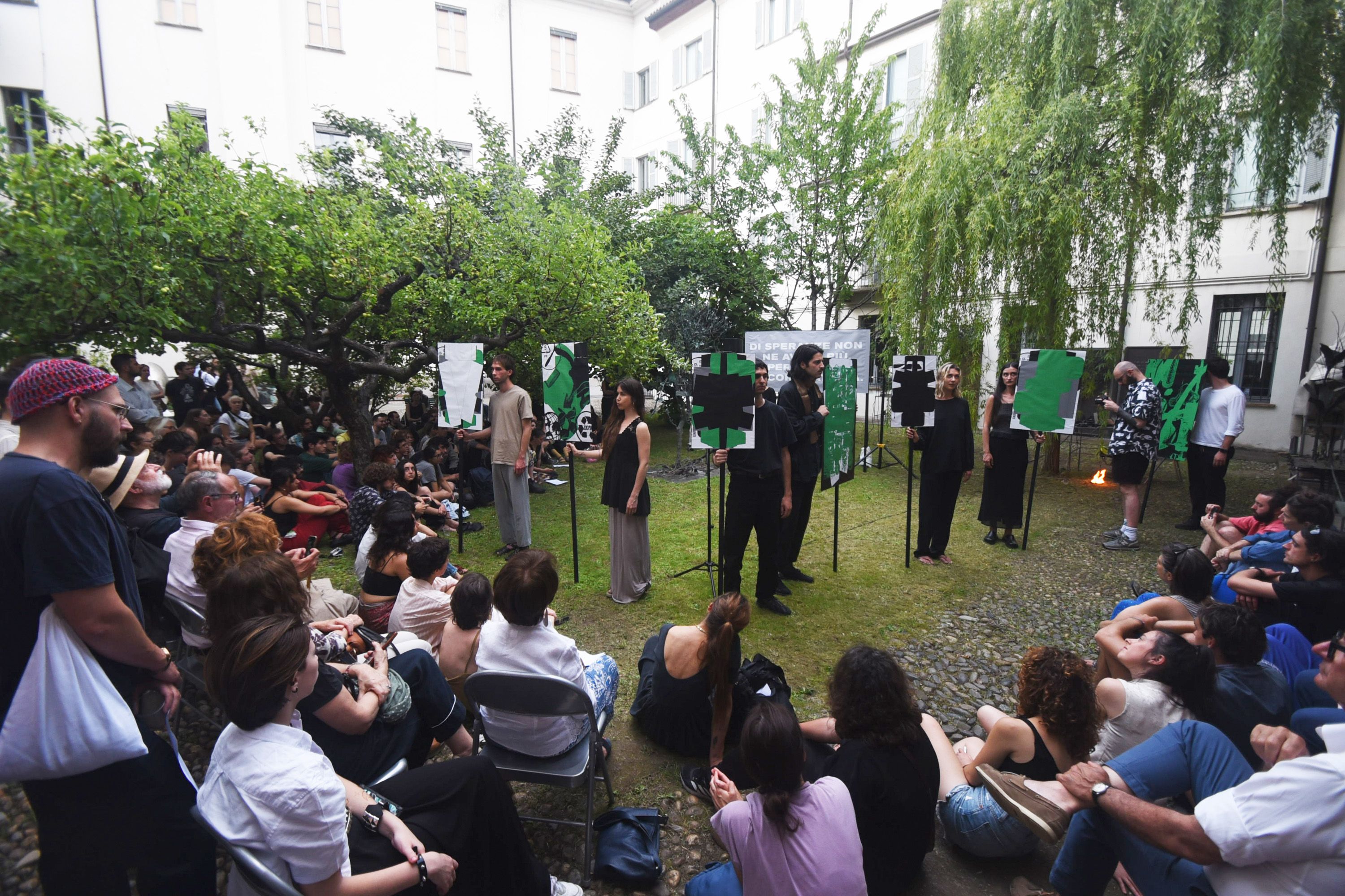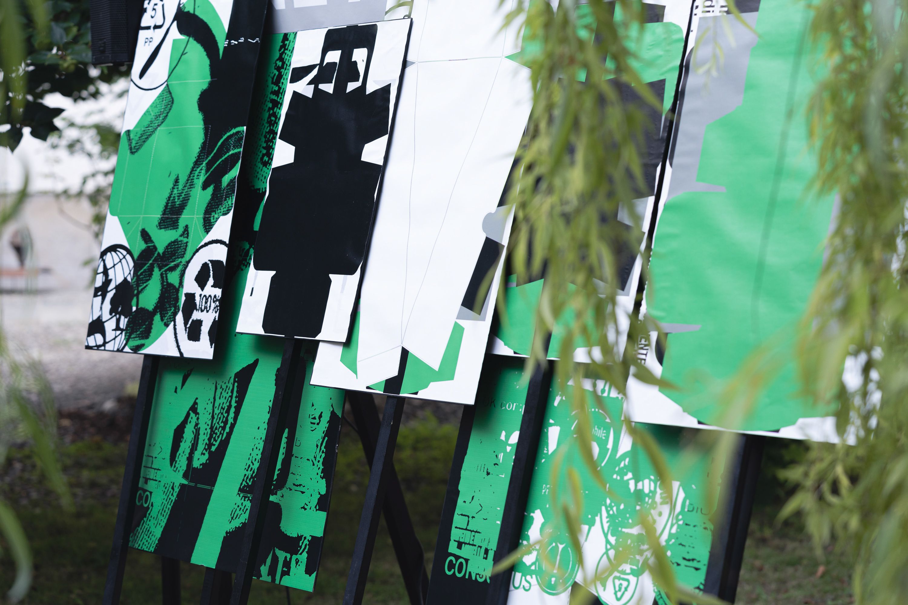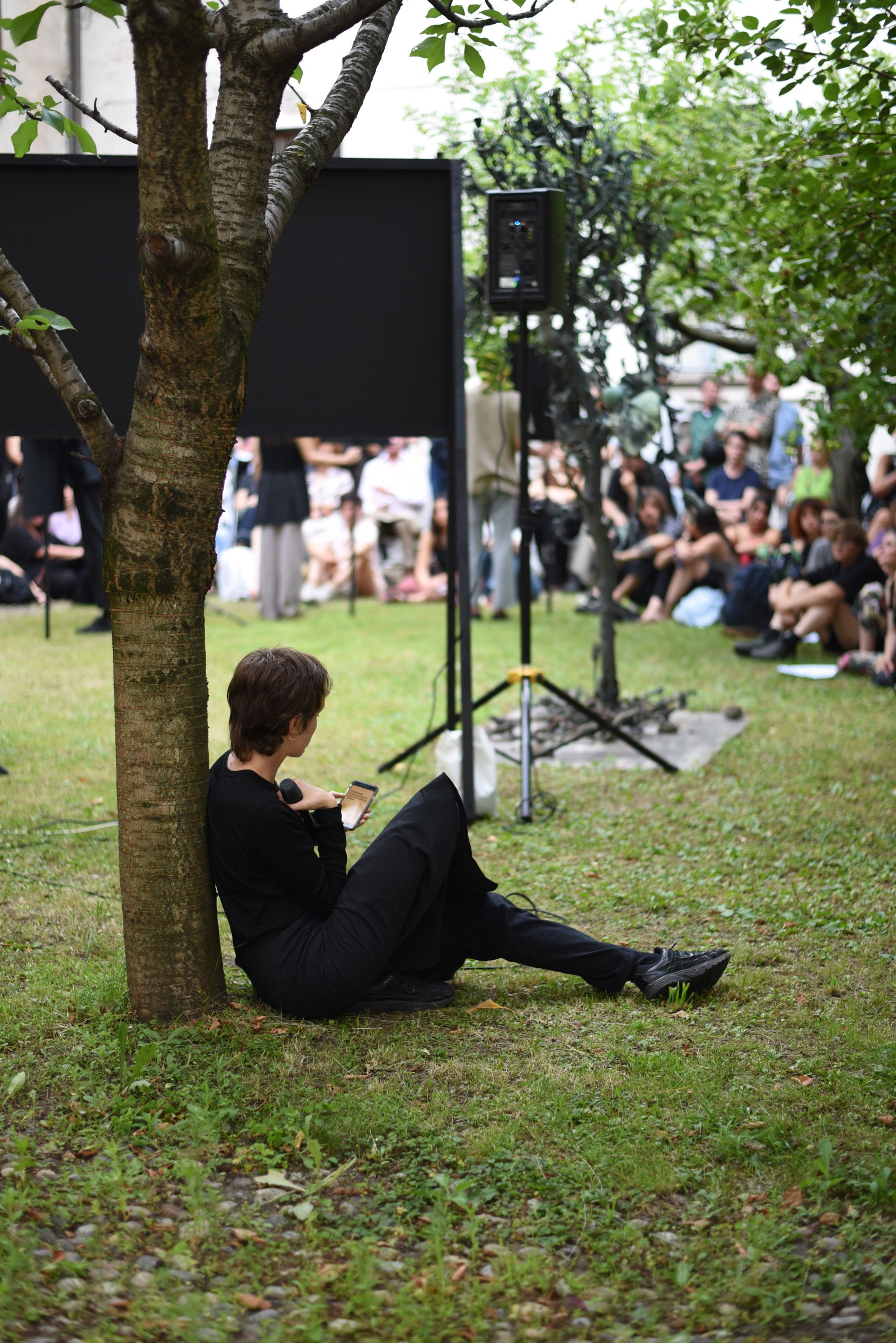 The performance unfolds in an enclosed garden, where Francesca Flora’s voice recites texts alluding to the language used by companies to mislead through greenwashing. Alongside her, seven green and black panels, inspired by environmental certification logos, reveal deceptive marketing techniques such as hiding the truth, using false labels, or emphasizing irrelevant aspects. The work’s ambiguity lies in the awareness that we are all subject to a system that deceives, sometimes unintentionally. As in Lem’s novel, we confront a world that is not as it seems, and the real struggle is the difficulty of resisting these deceptive realities.