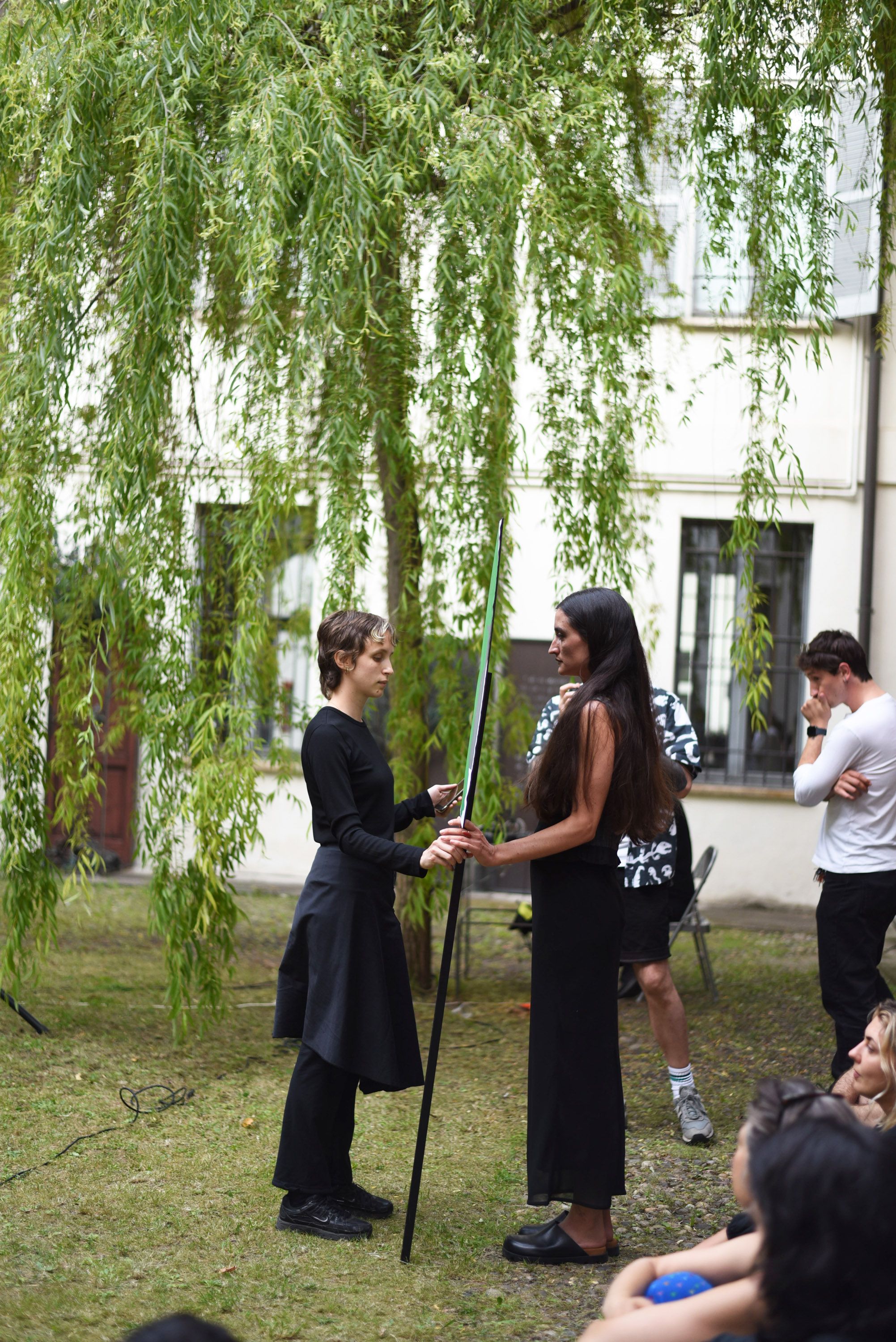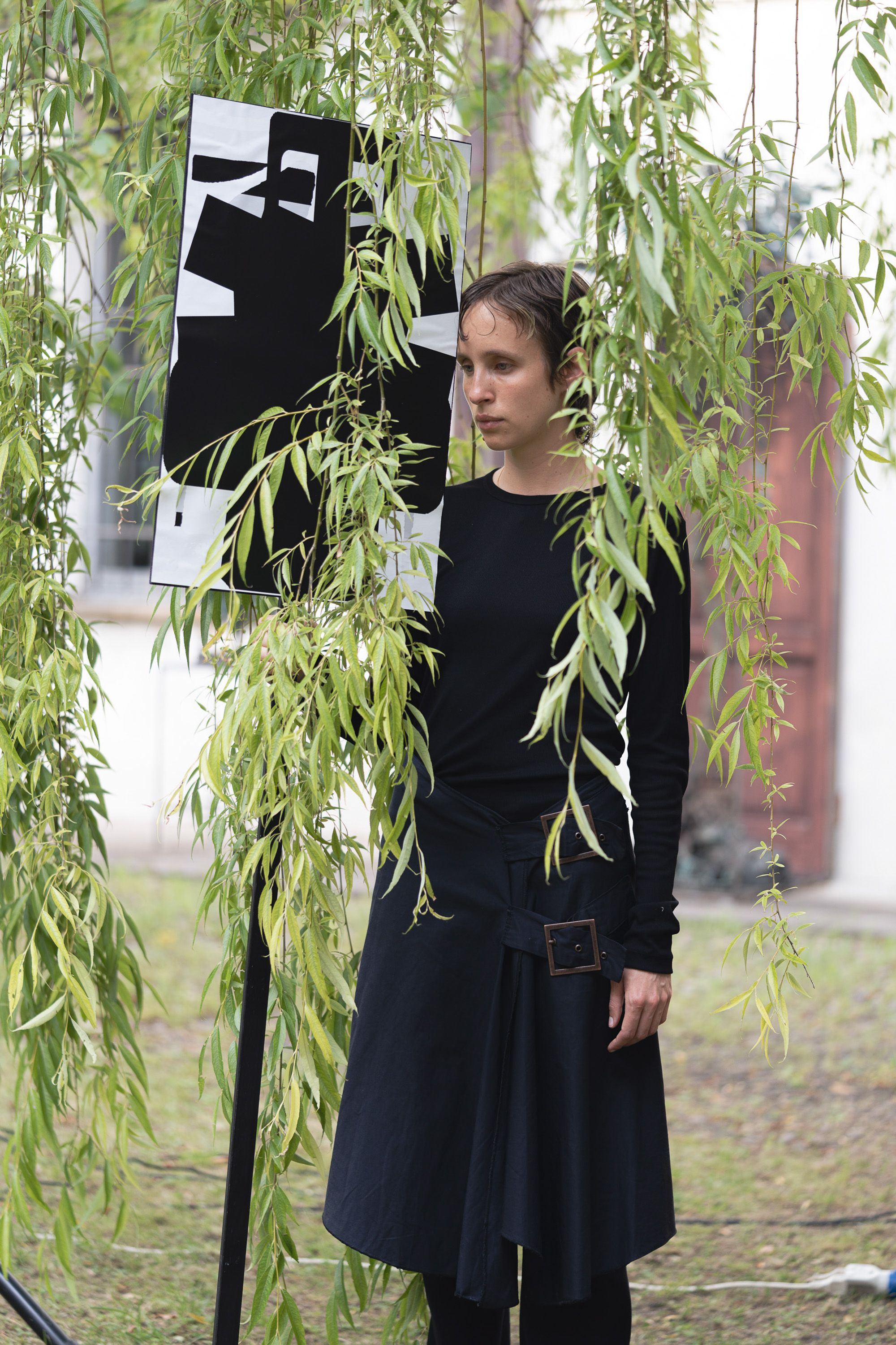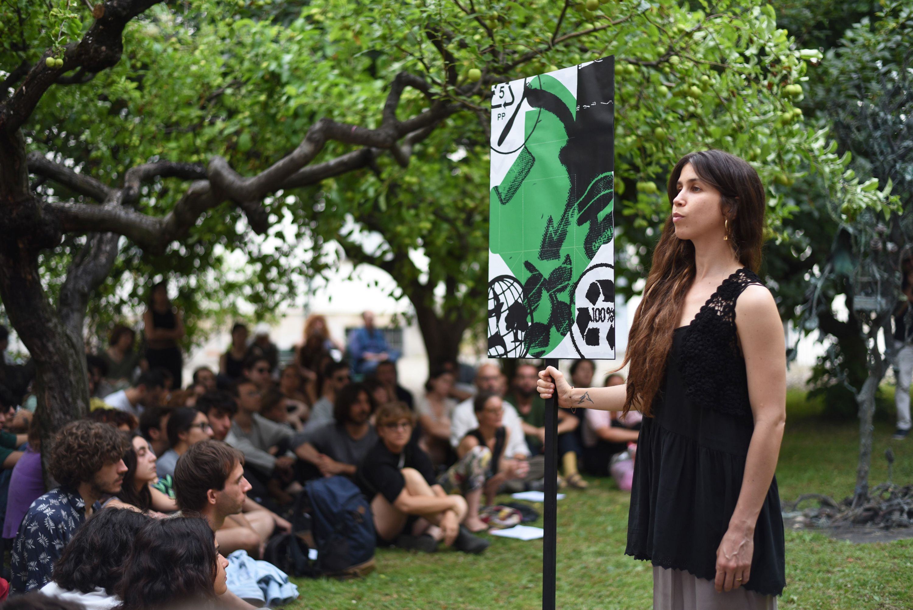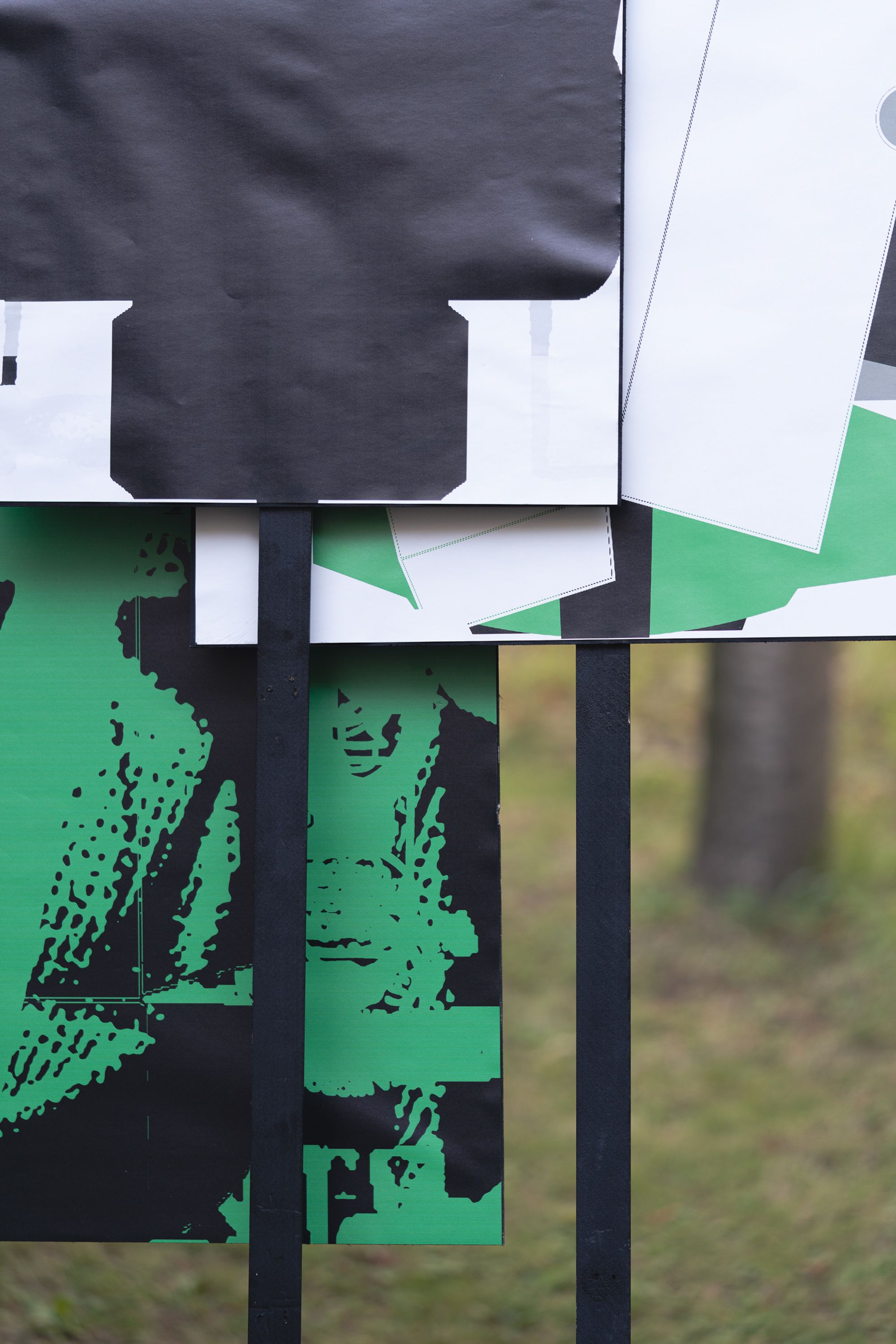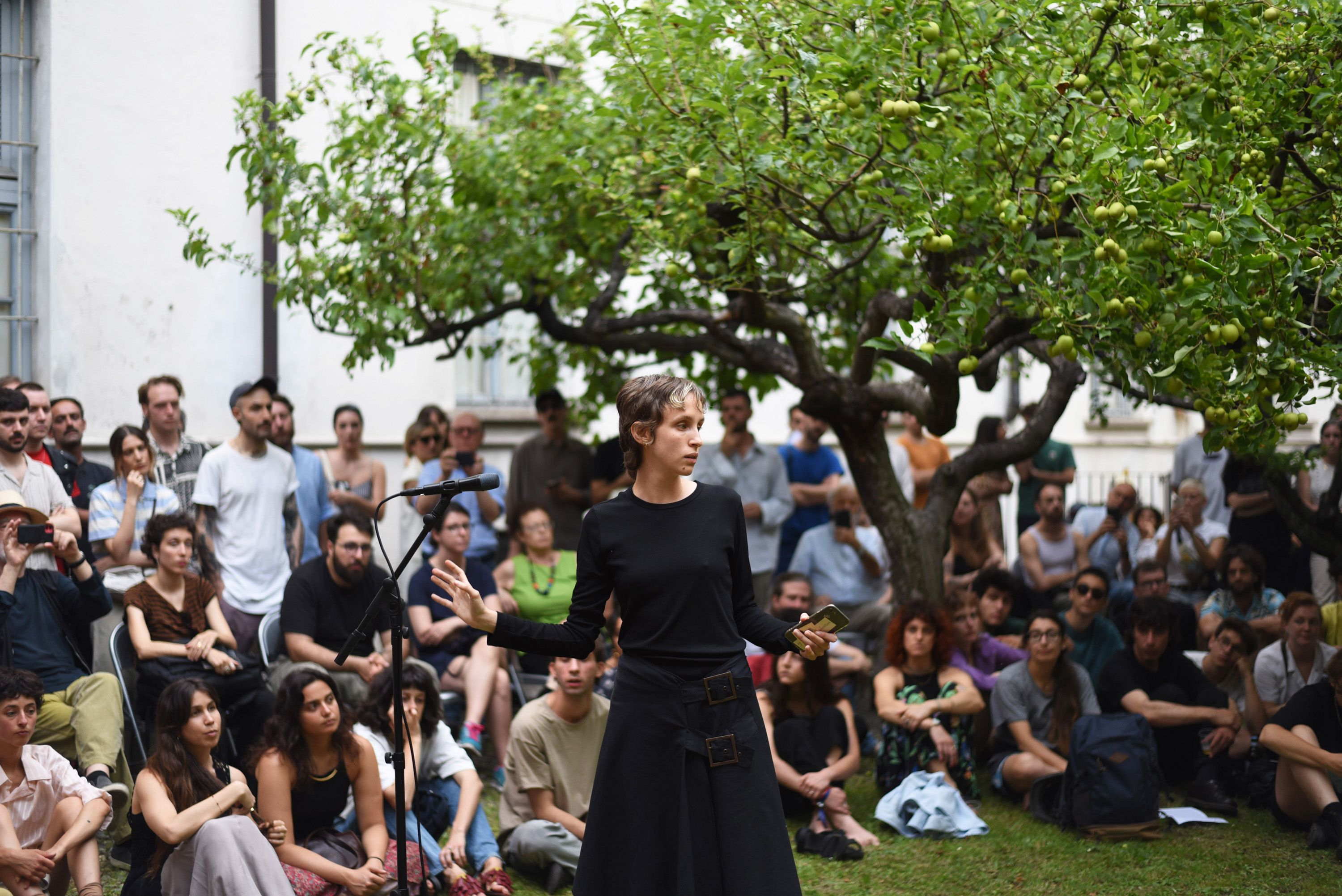 The performance unfolds in an enclosed garden, where Francesca Flora’s voice recites texts alluding to the language used by companies to mislead through greenwashing. Alongside her, seven green and black panels, inspired by environmental certification logos, reveal deceptive marketing techniques such as hiding the truth, using false labels, or emphasizing irrelevant aspects. The work’s ambiguity lies in the awareness that we are all subject to a system that deceives, sometimes unintentionally. As in Lem’s novel, we confront a world that is not as it seems, and the real struggle is the difficulty of resisting these deceptive realities.