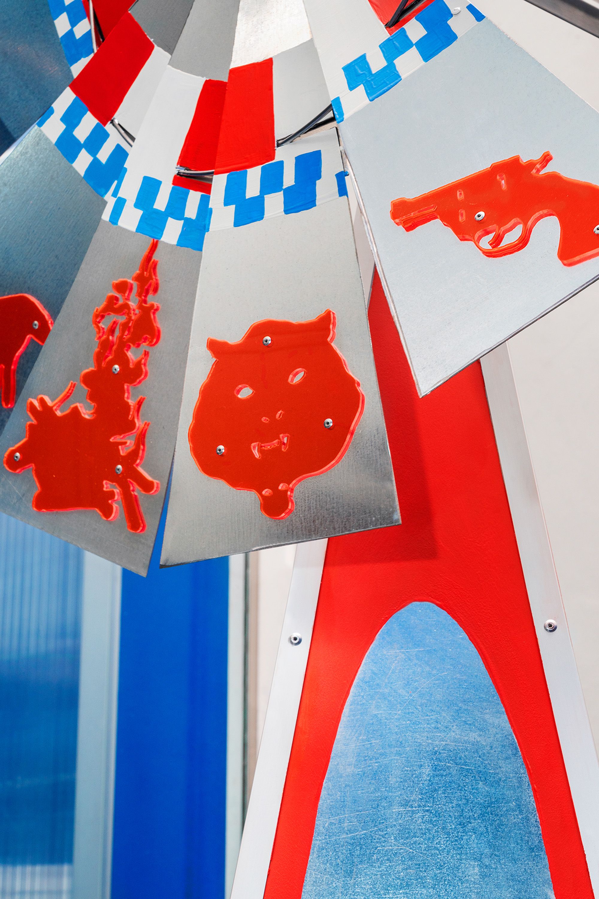MEMORY SPIN by Oliviero Fiorenzi is a site-specific installation that combines painting, sculpture, and movement to explore the power of play as a critical force. At the center of the work is a large propeller whose motion creates a pictographic pattern that produces an optical illusion, distorting perception and recreating the sensation of “vertigo” (ilinx) theorized by Roger Caillois. This feeling of self-loss translates into a critique of the aesthetic and institutional conventions of contemporary art.
