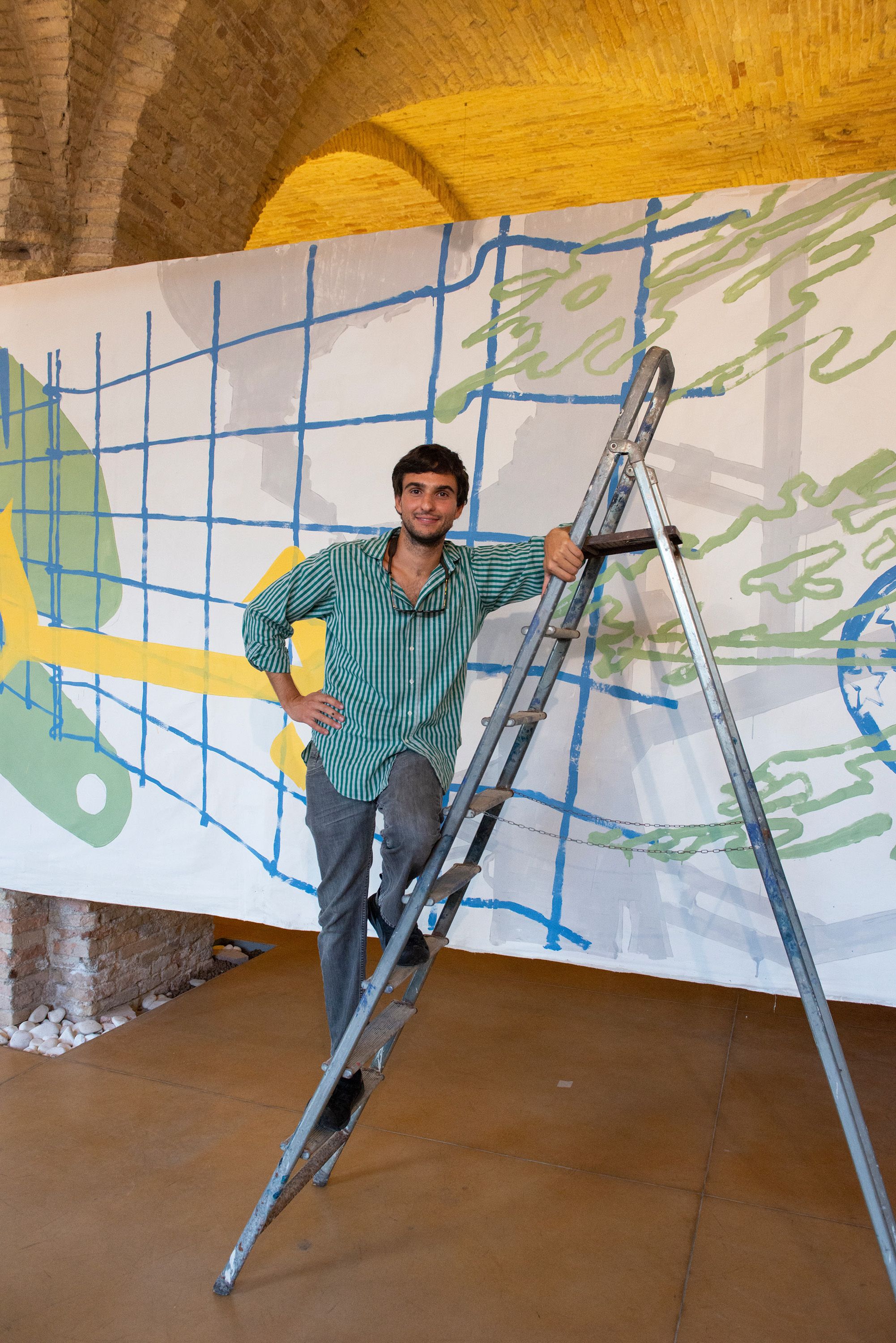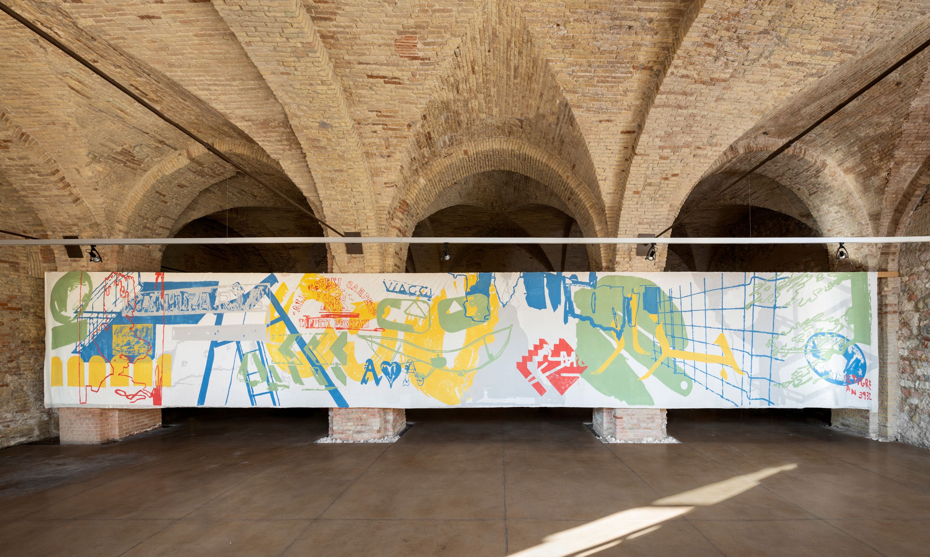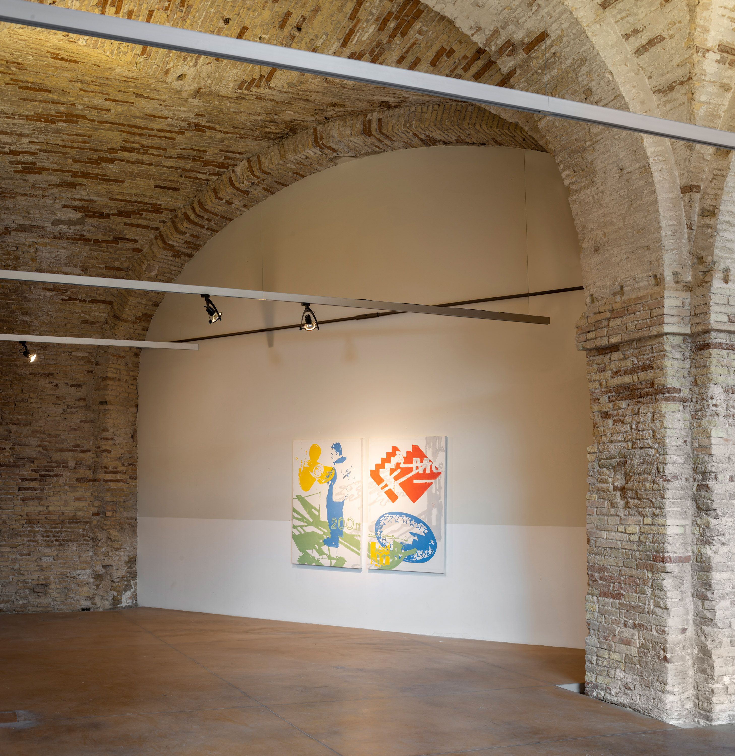 OPEN SIGNS (2020) is a site-specific project by Oliviero Fiorenzi created during an artist residency at the Mole Vanvitelliana. Through a daily routine of exploring the neighborhood, the artist collected symbols, signs, and urban memories, translating them into a mural painting displayed in the courtyard of the Mole. The project, which explores the dialogue between inside and outside, was presented on September 24, 2020, accompanied by a discussion curated by Elvira Vannini and Alessio Piancone.